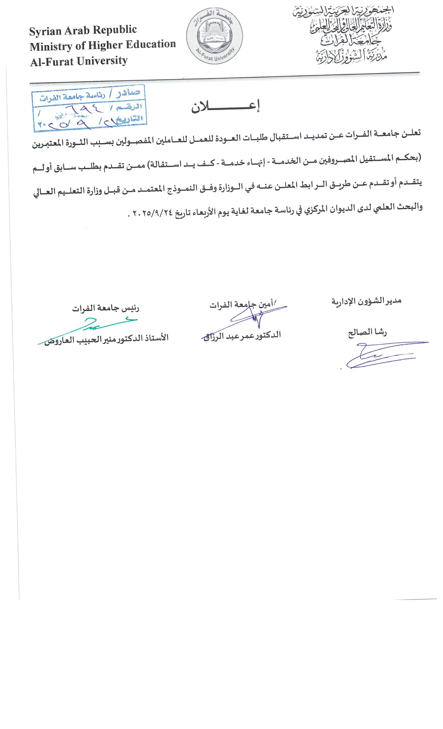 "إعلان للمنقطعين عن العمل في جامعة الفرات"