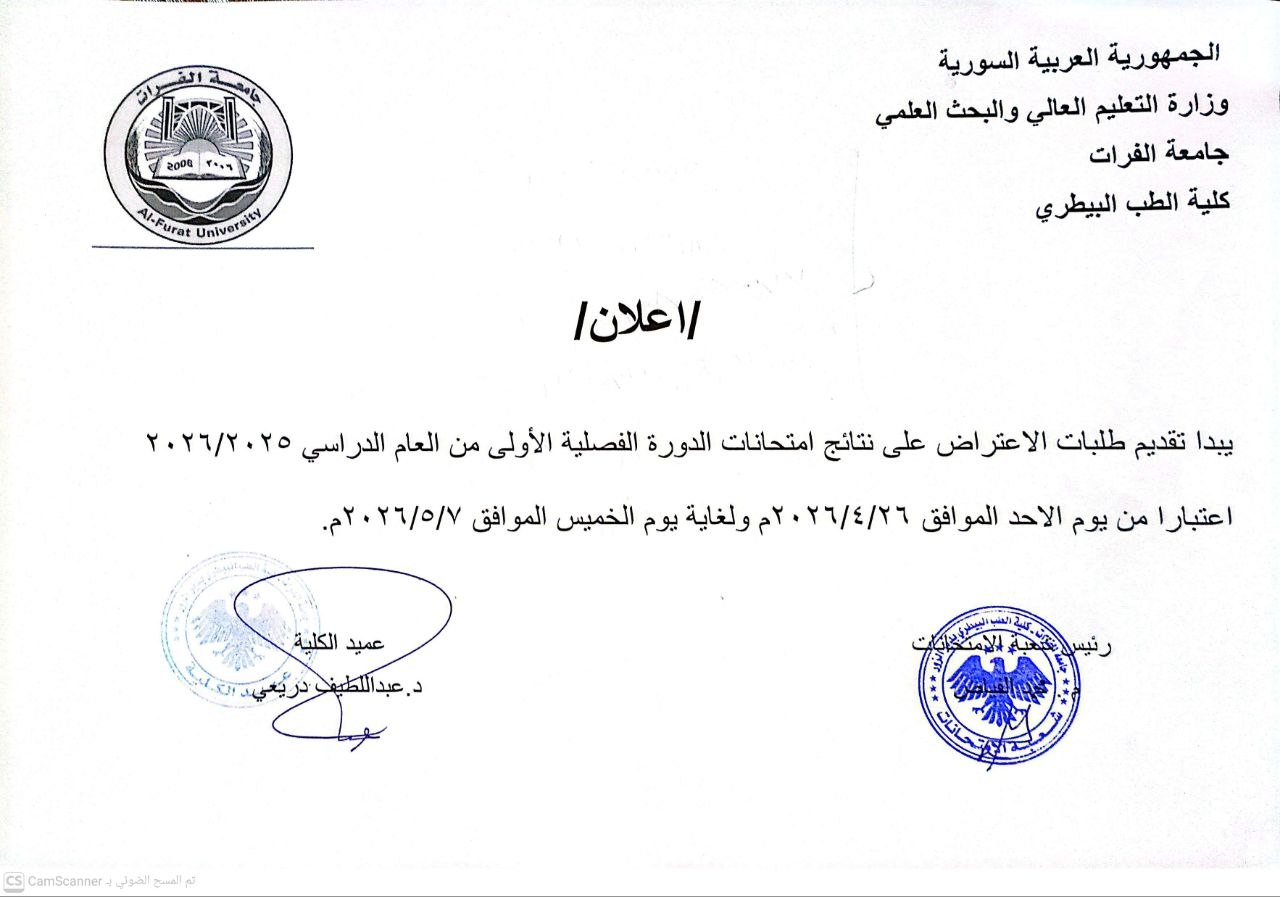 اعلنت عمادة كلية الطب البيطري عن فتح باب تقديم طلبات الاعتراض على النتائج امتحانات الدورة الفصلية الاولى من العام الدراسي الحالي على الطلاب الراغبين في الاعتراض على نتائجهم مراج...