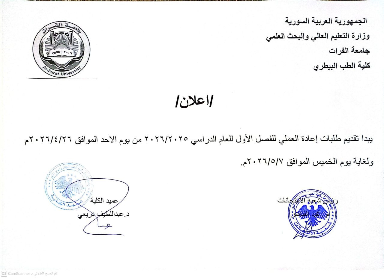 تعلن عمادة كلية الطب البيطري عن فتح باب تقديم طلبات إعادة العملي لمقررات الفصل الدراسي الثاني من العام الحالي على الطلاب الراغبين بالتقدم بطلب اعادة العملي مراجعة شعبة شؤون الطل...
