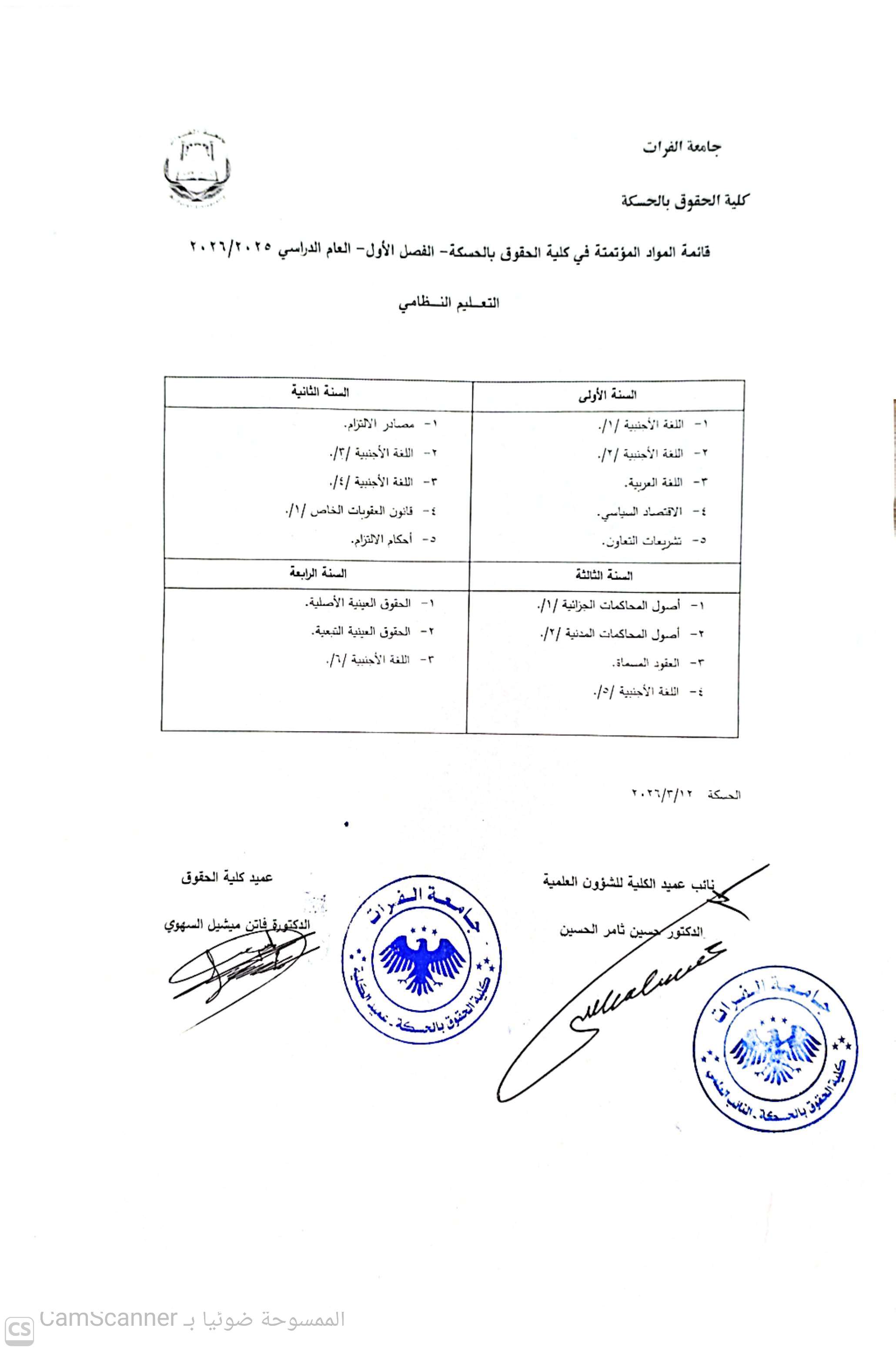 الاعلان عن قاىمة باسماء المقررات المؤتمتة الفصل الاول 2026/2025