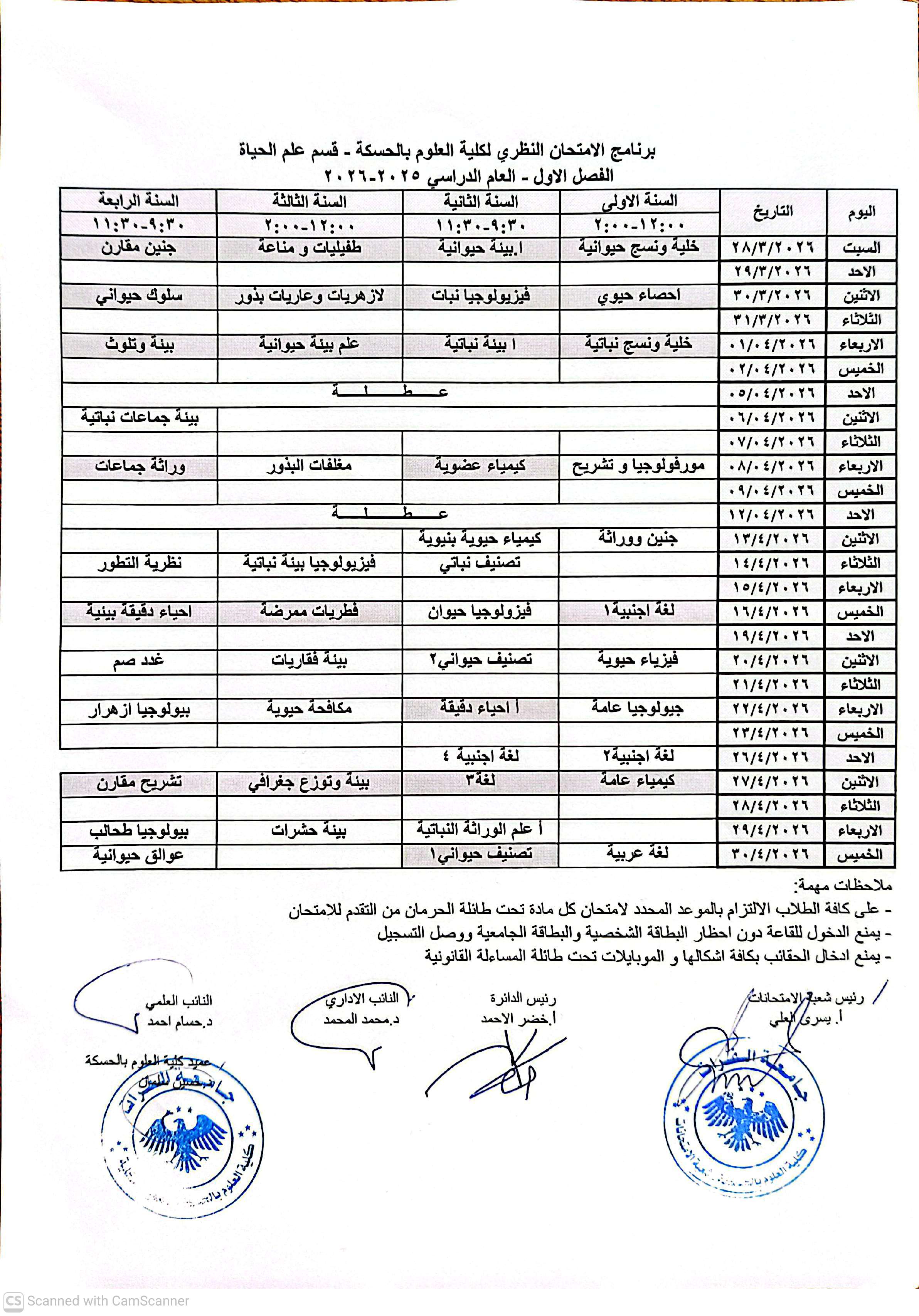 برنامج الامتحان النظري لكلية العلوم بالحسكة قسم علم الحياة