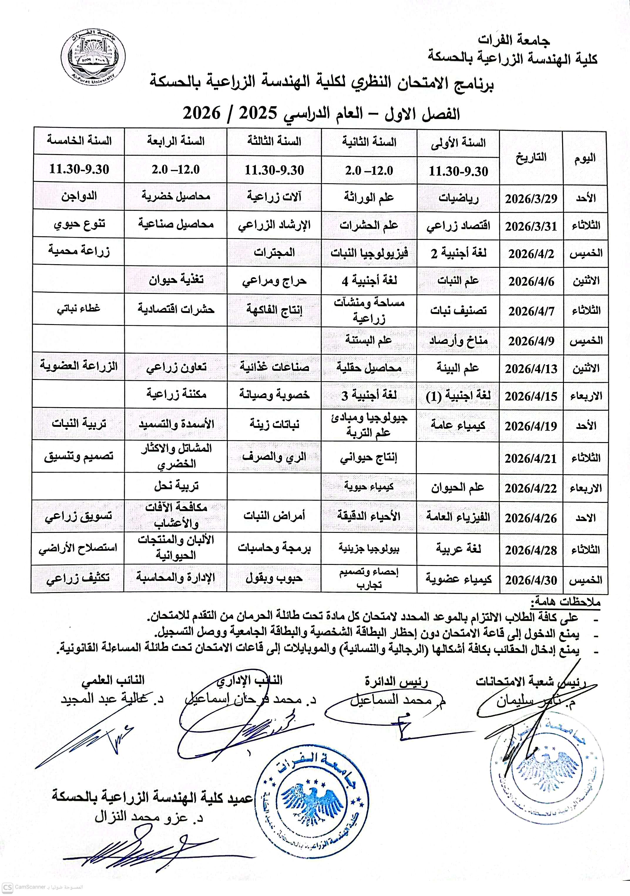 كلية الهندسة الزراعية بالحسكة تعلن برنامج الامتحان النظري للفصل الاول من العام الدراسي 2025-2026.