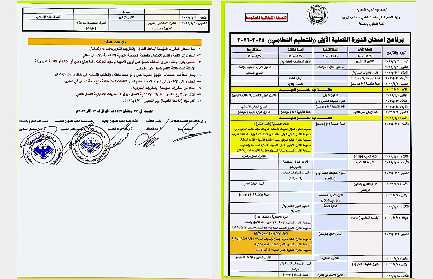 تعلن عن برنامج امتحان الدورة الفصلية الأولى(#النسخة #النهائية #والمعدلة)) للعام/2026/2025/ لطلاب التعليم النظامي.