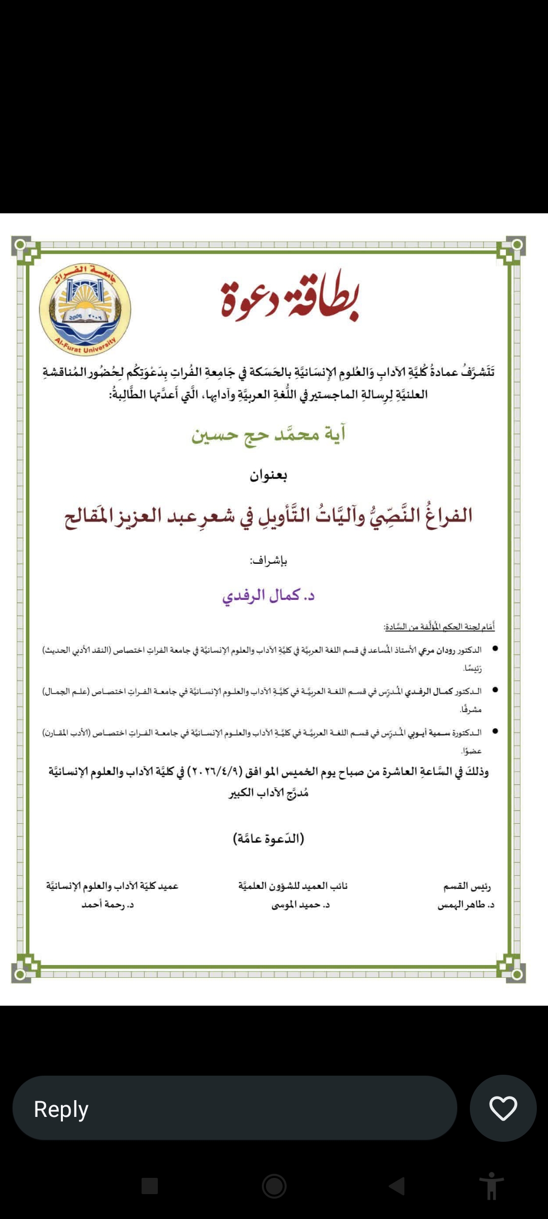 تتشرف كلية الآداب والعلوم الإنسانية بالحسكة بدعوتكم لحضور المناقشة العلنية لرسالة الماجستير الموسومة ب (الفراغ النصي وآليات التأويل في شعر عبد العزيز المقالح)