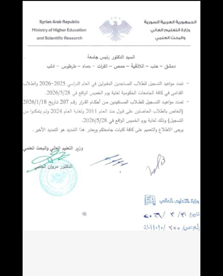 The Minister of Higher Education issued a decision extending registration dates until 5/28/2026