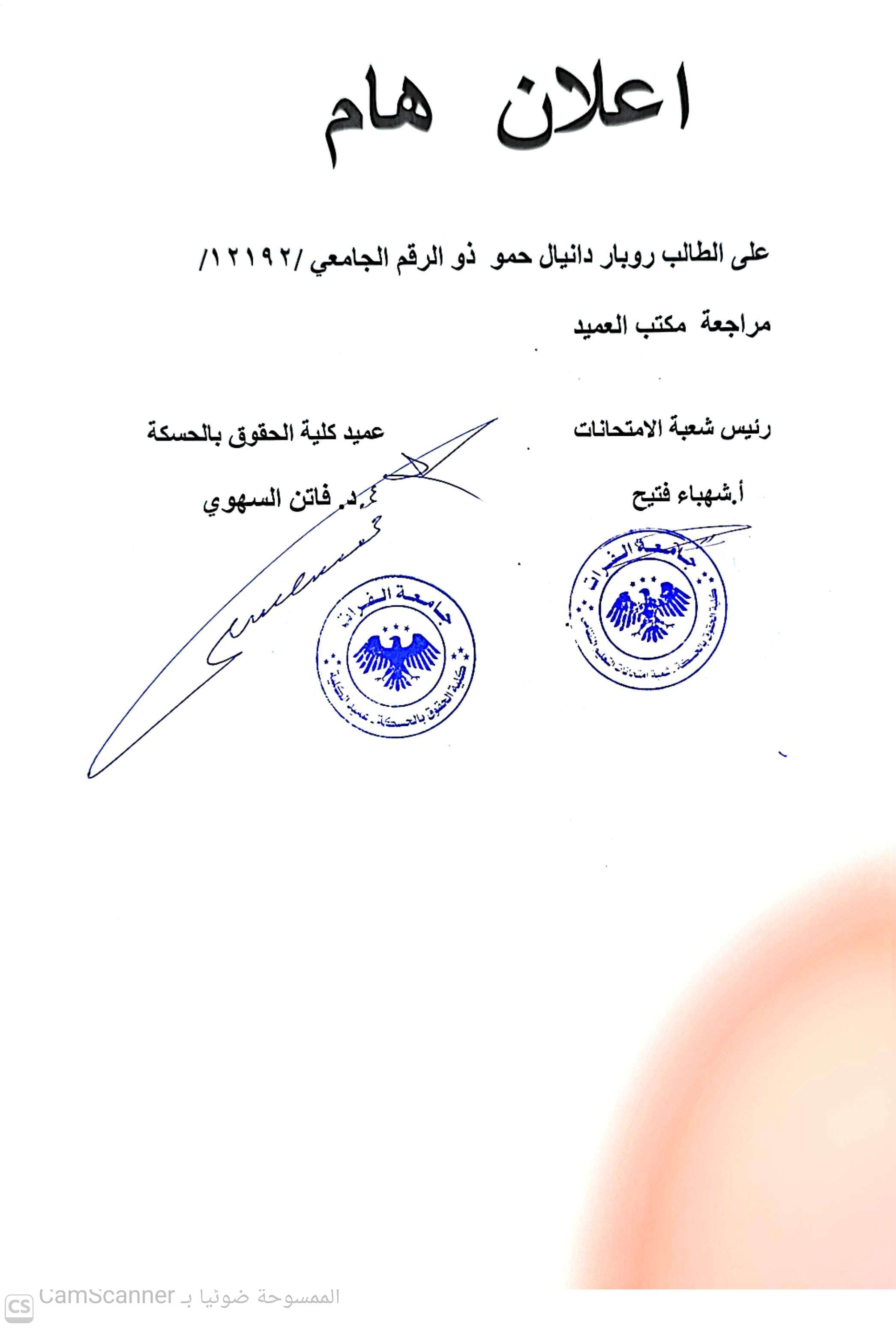 أسماء دفعة من الطلاب المنقطعين والذين يحق لهم إعادة قيدهم إلى كلية الحقوق بدير الزور وفق القرار رقم /٩٥/