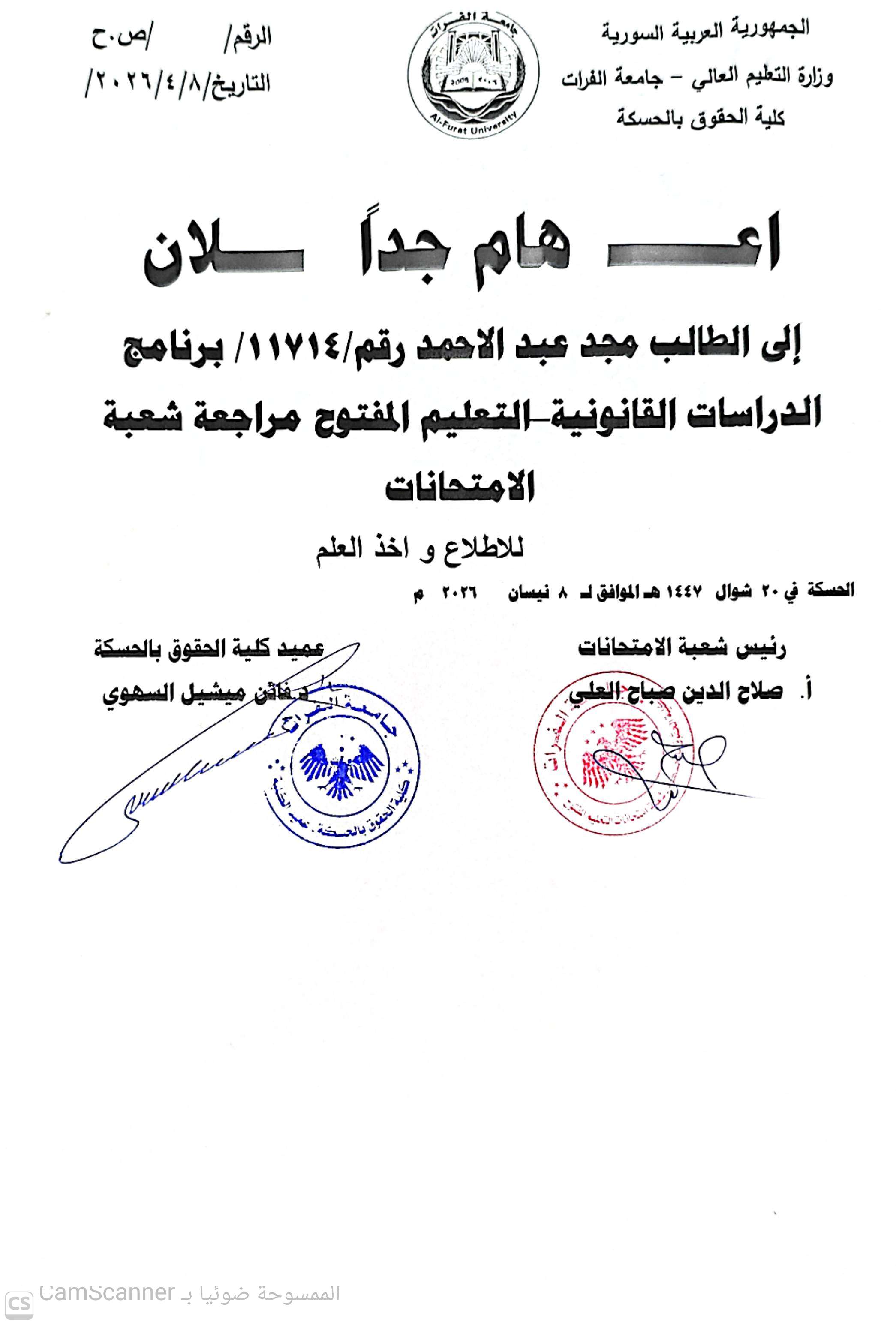 اعلان مراجعة الطالب مجد عبد الاحمد ادارة الكلية