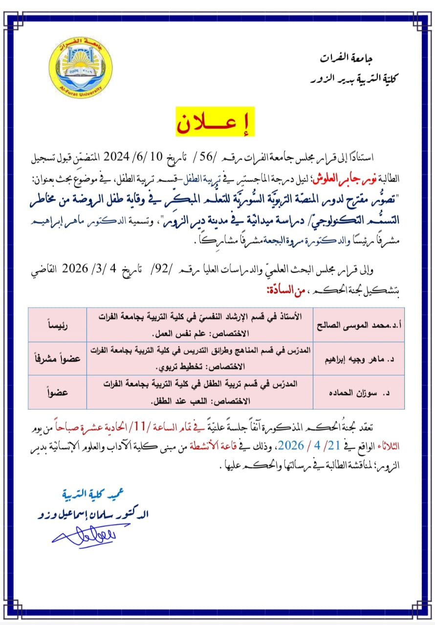 Das Dekanat der Pädagogischen Hochschule freut sich, Sie zur öffentlichen Diskussionsrunde zur Masterarbeit des Studenten Nour Al-Aloush am Dienstag, den 21.04.2026, um 11:00 Uhr im Veranstaltungssaal des Gebäudes der Hochschule für Künste und Geisteswissenschaften in Deir ez-Zor einzuladen. Um die Abschlussarbeit der Studentin zu besprechen und sie zu beurteilen.