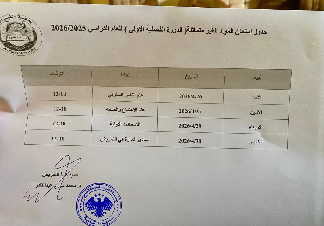 صدور جدول المواد الغير متماثلة في كلية التمريض للعام الدراسي 2025 -2026