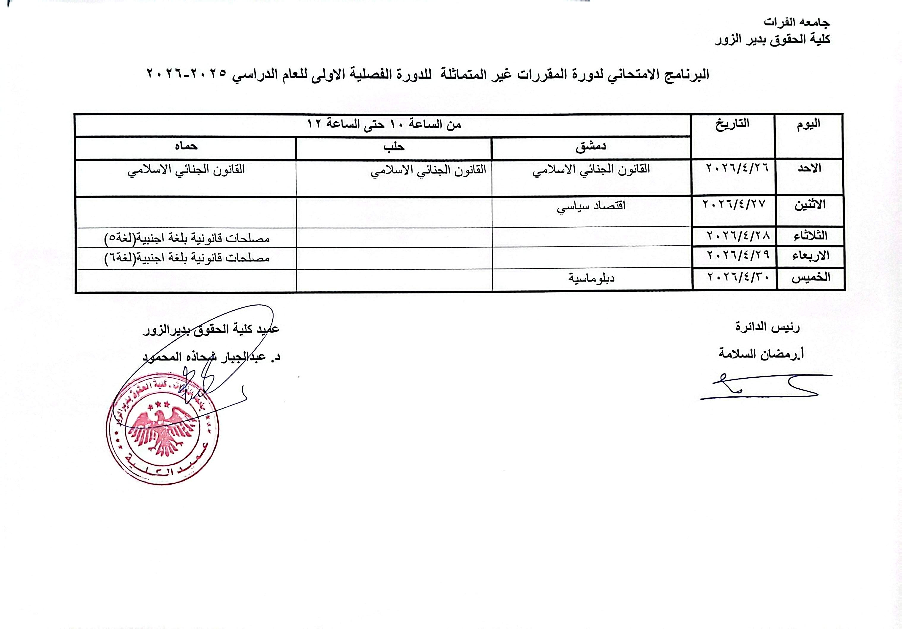 برنامج امتحان المقررات غير المتماثلة للدورة الفصلية الأولى من العام الدراسي ٢٠٢٥/٢٠٢٦.