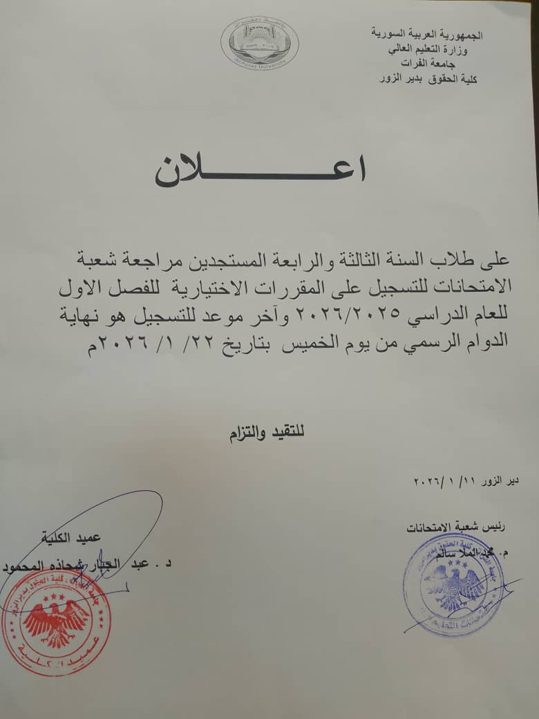 علماً أن آخر موعد للتسجيل هو نهاية الدوام الرسمي من يوم الخميس ٢٢/١/٢٠٢٦.
