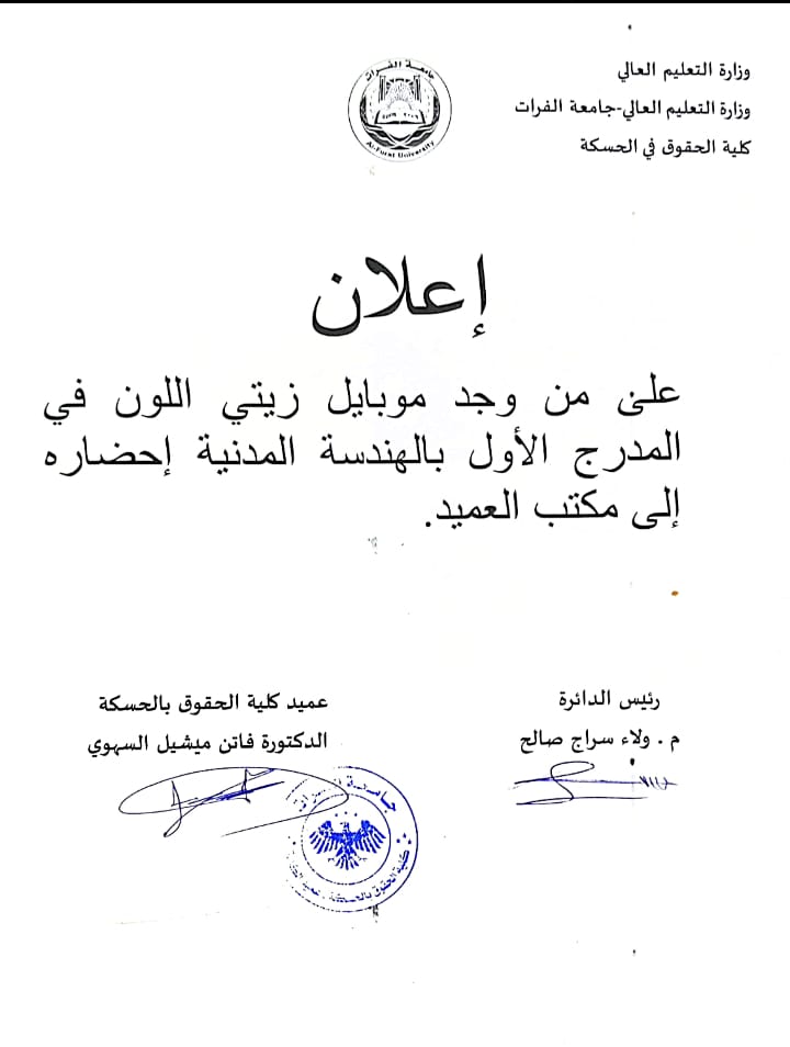 Haseke'deki İnşaat Mühendisliği Fakültesi salonunda zeytin renginde bir mobil cihazın kaybı