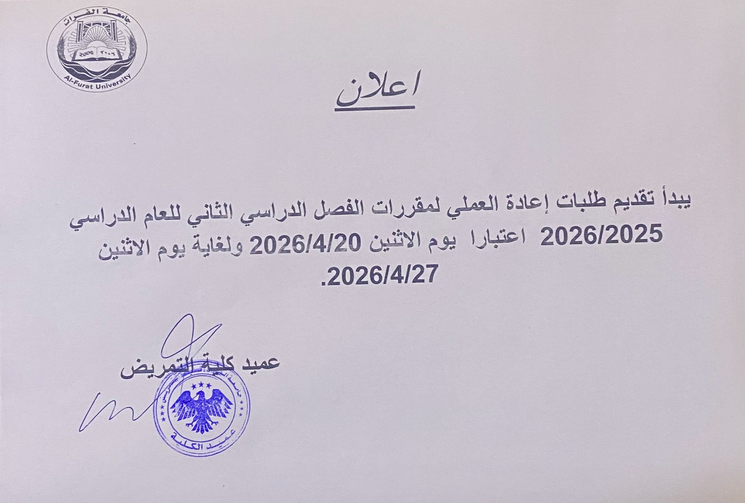 اعلان بدء تقديم طلبات اعادة العملي للفصل الدراسي الثاني
