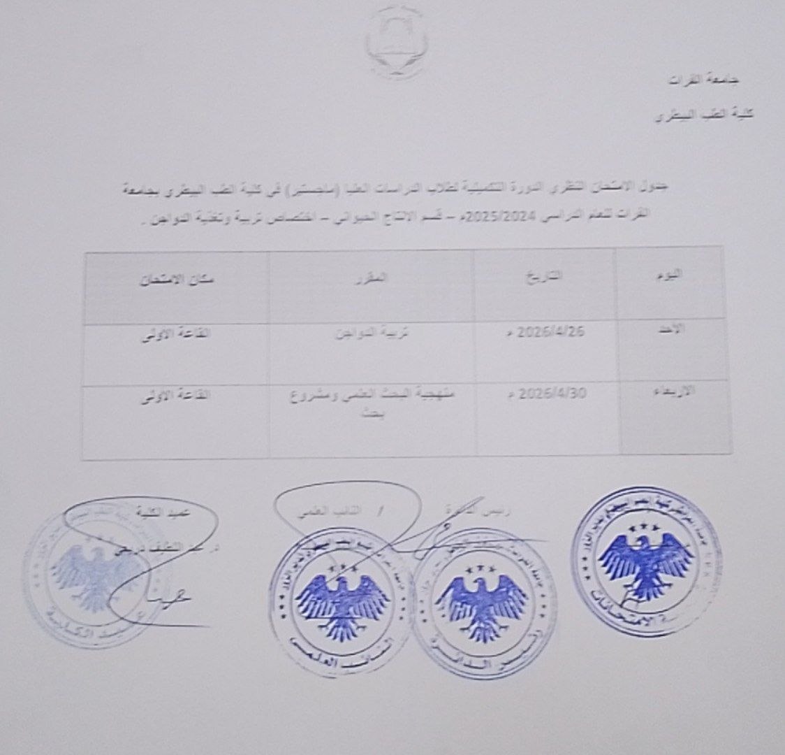 صدور جدول الامتحان التكميلي لطلاب الدراسات العليا ( الماجستير ) في كلية الطب البيطري للعام الدراسي 2024-2025 قسم الانتاج الحيواني