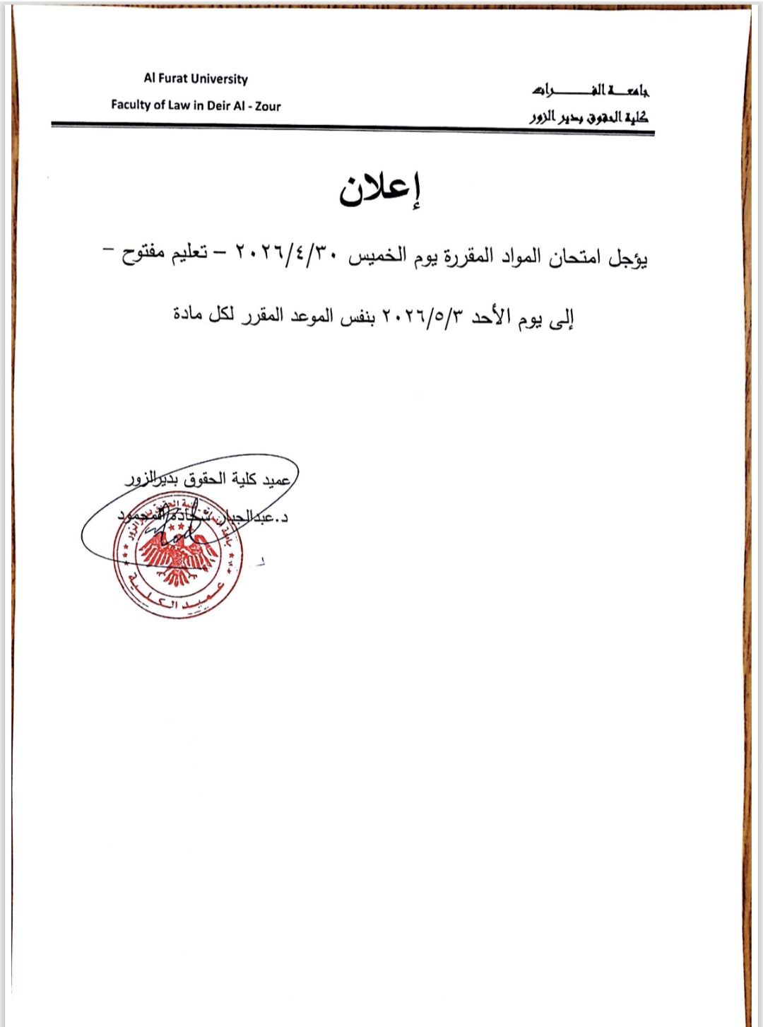 تأجيل امتحان المواد المقررة يوم الخميس ٣٠/٤/٢٠٢٦ إلى يوم الأحد ٣/٥/٢٠٢٦ لطلاب التعليم المفتوح