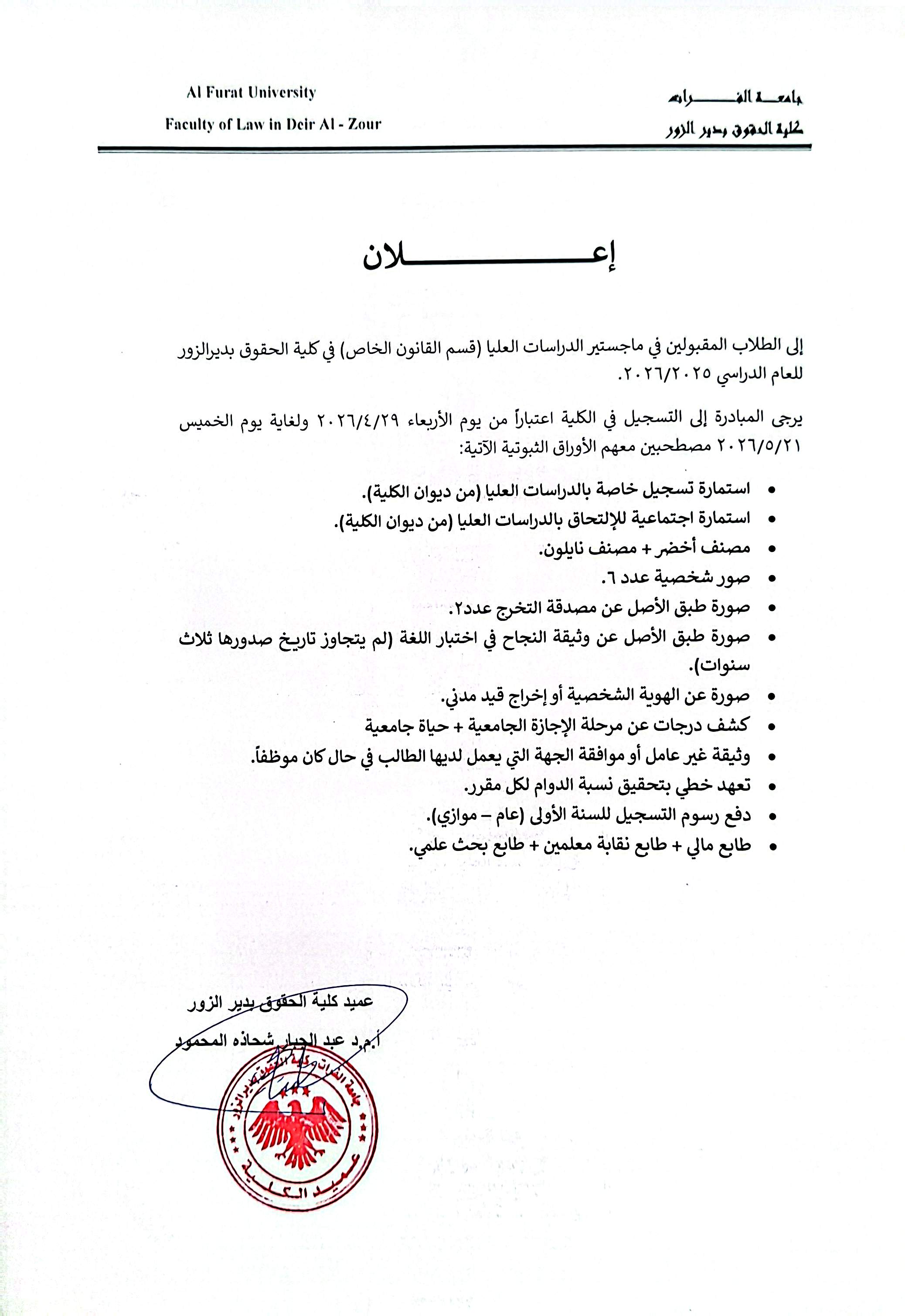 على الطلاب المقبولين في برنامج الدراسات العليا (ماجستير القانون الخاص) للعام الدراسي ٢٠٢٥/٢٠٢٦، المبادرة إلى التسجيل في الكلية اعتباراً من يوم الأربعاء ٢٩/٤/٢٠٢٦ ولغاية يوم الخميس ٢١/٥/٢٠٢٦، مصطحبين معهم الاوراق الثبوتية الواردة في الإعلان المرفق.