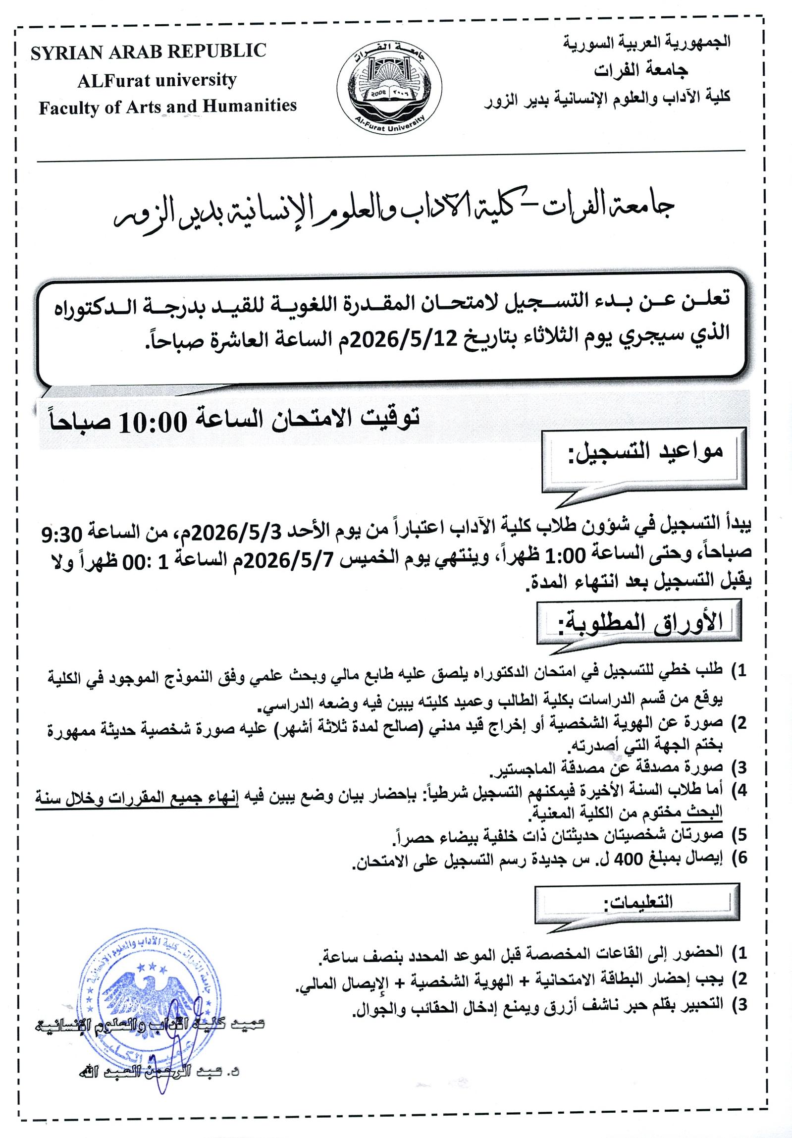 تعلن كلية الآداب والعلوم الإنسانية بدير الزور عن بدء التسجيل لامتحان المقدرة اللغوية للقيد بدرجة الدكتوراه الذي سيجري يوم الثلاثاء بتاريخ 12-5-2026م الساعة العاشرة صباحاً. يبدأ التسجيل في شؤون طلاب كلية الآداب اعتباراً من يوم الأحد 3-5-2026م من الساعة 9 صباحاً وحتى الساعة 1 ظهراً، وينتهي يوم الخميس 7-5-2026م الساعة 1 ظهراً ولا يقبل التسجيل بعد انتهاء المدة.