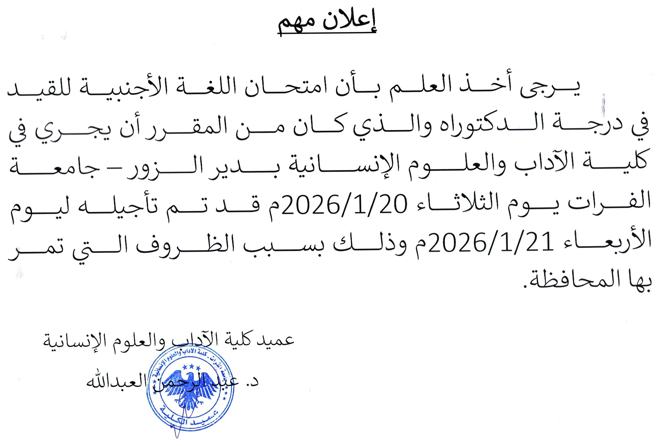 يرجى أخذ العلم بأن امتحان اللغة الأجنبية للقيد في درجة الدكتوراه والذي كان من المقرر أن يجري في كلية الآداب والعلوم الإنسانية بدير الزور – جامعة الفرات يوم الثلاثاء 20/1/2026م قد تم تأجيله ليوم الأربعاء 21/1/2026م وذلك بسبب الظروف التي تمر بها المحافظة.