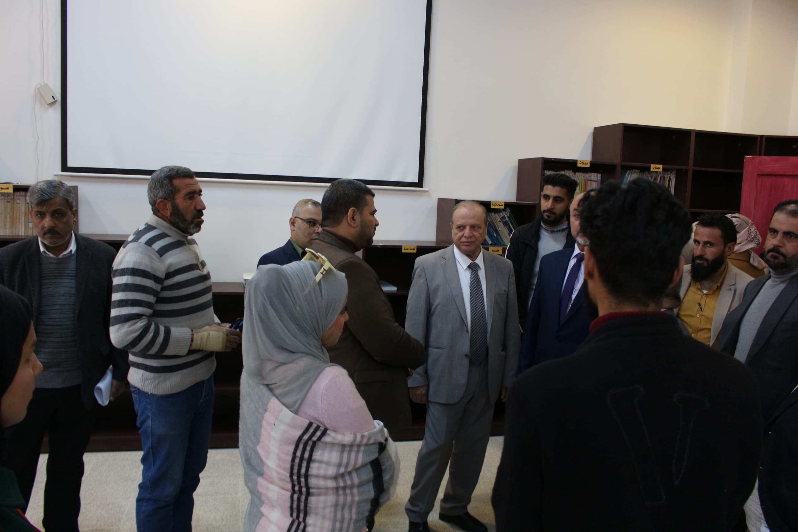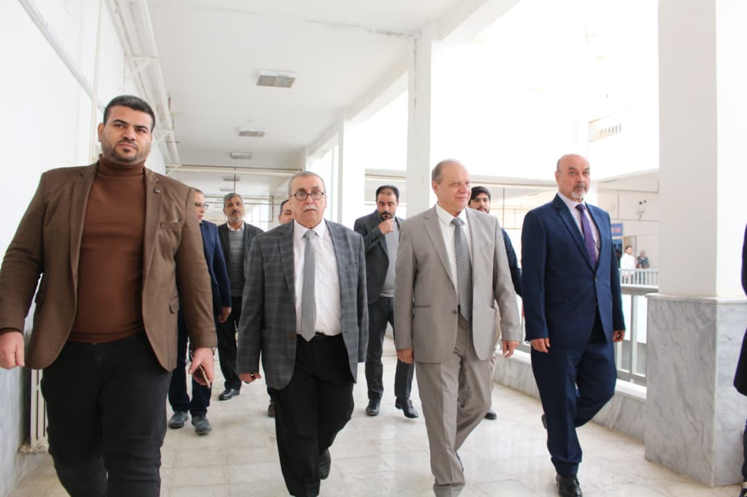 Prof. Dr. Mounir Al-Habib Al-Aroud, President of Al-Furat University, accompanied by the Vice-Presidents of the University, Prof. Dr. Ali Amir (for Scientific Affairs), Prof. Dr. Muhammad Al-Mousa Al-Saleh (for Administrative and Student Affairs), and Dr. Abdul Rahman Al-Abdullah, Dean of the College of Arts, opened the library of the College of Arts and Human Sciences in Deir Ezzor.